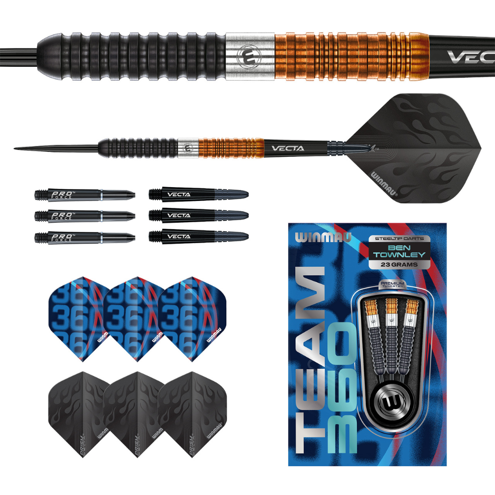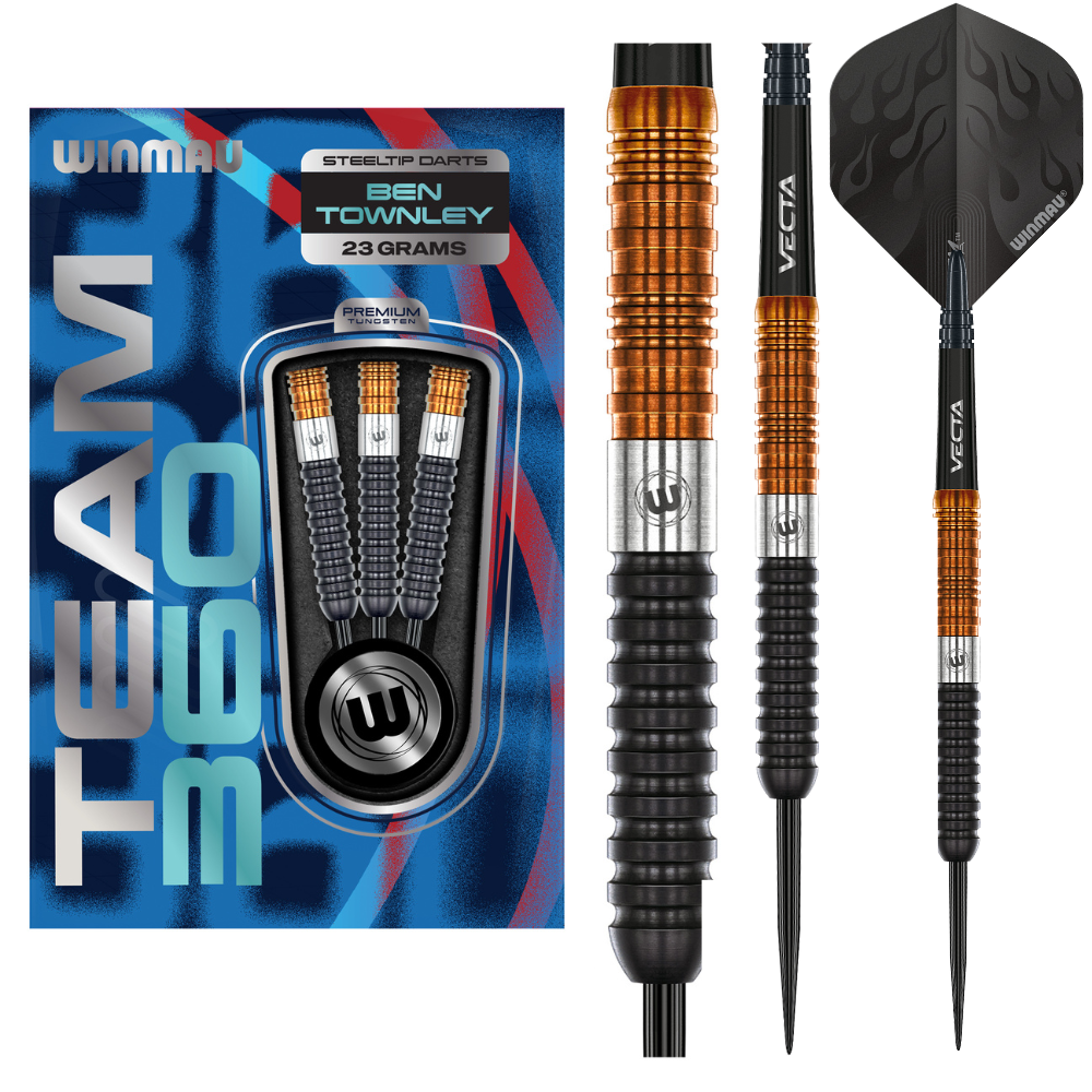 Designed in collaboration with Team 360 talent Ben Townley, these 90% tungsten darts combine striking style with performance-driven engineering. The tri-section ring grip — black rear, silver mid, and copper front — provides a dynamic feel in the hand, offering superb control across all grip styles. With a compact 49.28mm profile and 6.4mm diameter, these darts are built for confident, consistent release and pinpoint accuracy.
