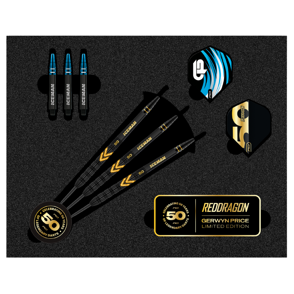 Gerwyn Price – 50 Year Limited Edition Dart Gerwyn Price’s signature playing darts are reborn in this Limited Edition homage to the Welsh phenom. They elevate the tungsten that built his legacy, and win a world championship, with a sleek black Onyx coating and 24-carat gold defiance.