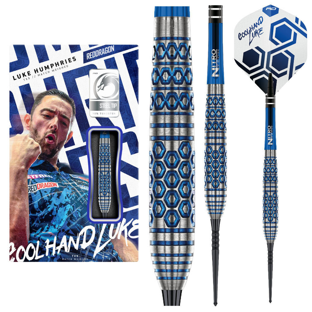 Play like “Cool Hand Luke” with the Luke Humphries Signature TX5 Darts. Featuring 90% tungsten torpedo barrels, Nitro Tech shafts, and a striking blue and silver design, these darts deliver the precision and balance of a champion.