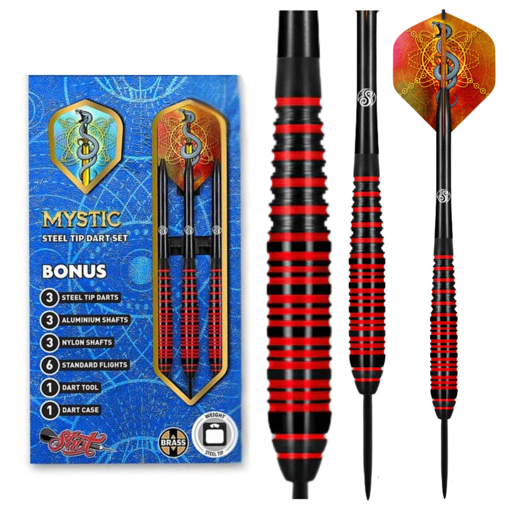 This total steel tip darts package from Shot Darts will get the game started. There's all the dart kit you need to play at your greatest: 3 precision dart made from premium brass, durable aluminum shafts, custom-designed dart flights, flight protectors plus spare shafts and flights, and a dart tool to ace dart games and tournaments. Protect your darts set with the tough pocket-sized darts case included. Designed by Shot for high scoring potential and backed with a ten-year barrel guarantee.