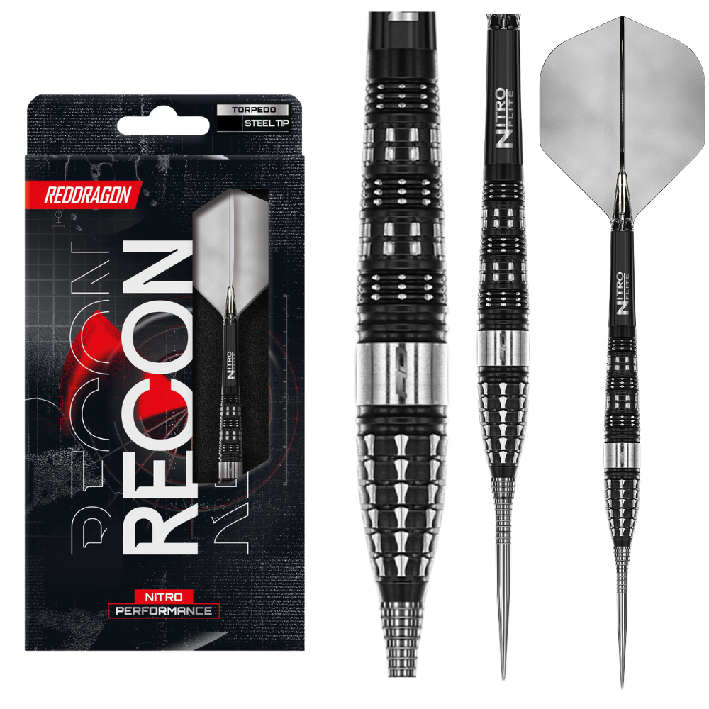 Command the oche with Red Dragon Recon Darts – precision-engineered in striking black and silver. Featuring advanced technical milling with angled grip cuts for ultimate control, balance, and accuracy.
