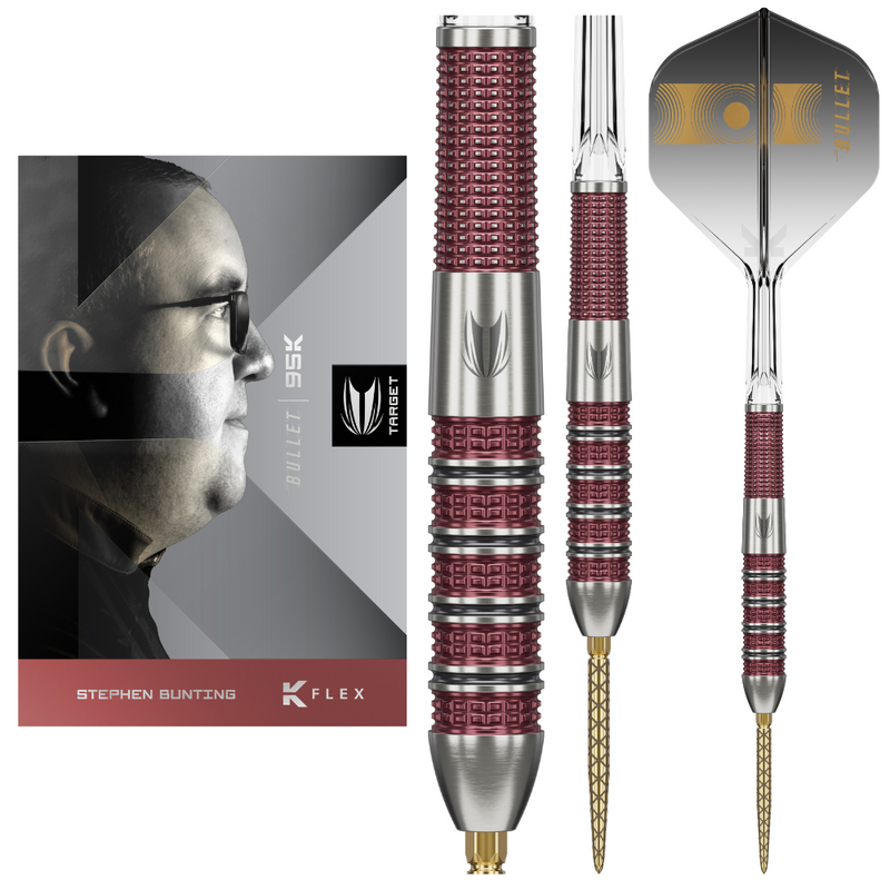 Completing the setup are the exclusive No.2 shaped K-Flex shafts and flights, featuring a sleek black gradient design printed with Stephen Bunting’s signature branding and iconic nickname, “The Bullet.” The integrated K-Flex system uses precision molding to ensure consistent 90-degree flight angles for stable, aerodynamic throws every time.